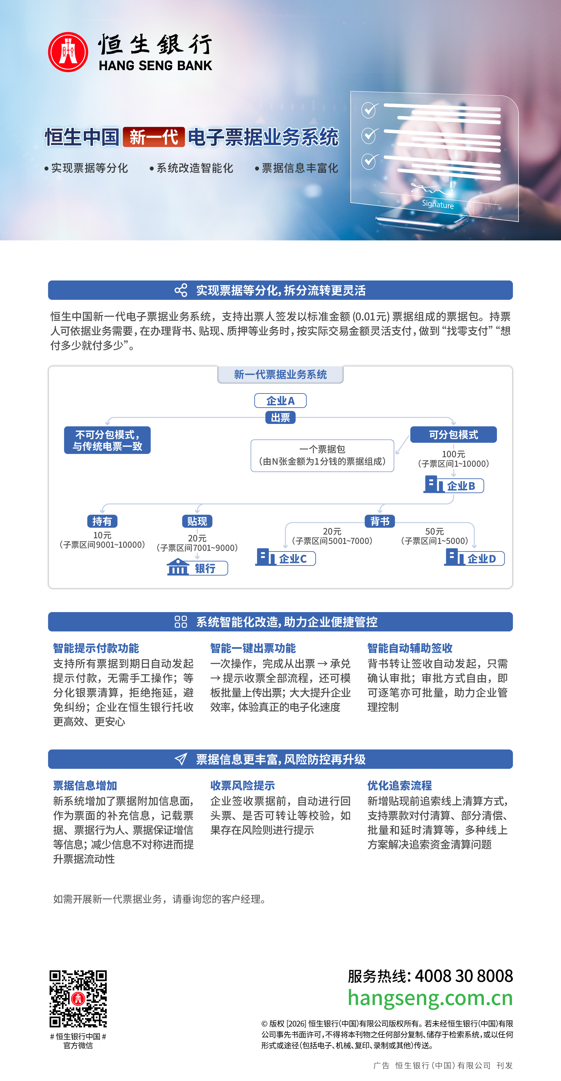 We provide you with an Electronic Bank Acceptance Draft solution, which is fully digitized solution offers Draft Issuance and Acceptance, Discounting, Pledge and etc. We also offers Commercial Acceptance Draft Discounting service. |